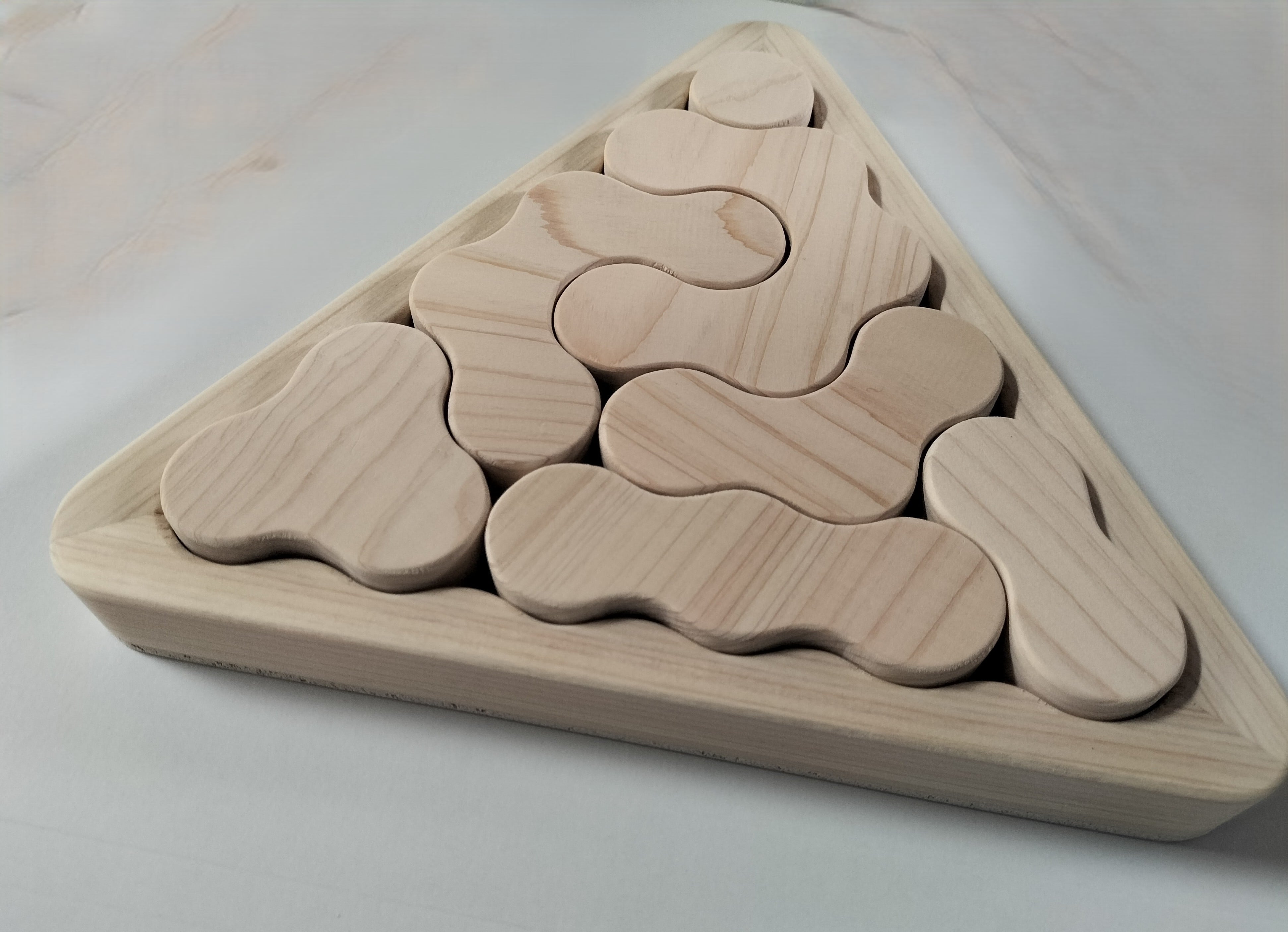 丸の形をつなげたピースを、ピラミッド型の枠に入れてみましょう。